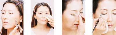 如果是一般粉状的的眼影(饼),先用眼影刷沾少量的眼影,画在眼窝处,然后再一层一层上眼影,可做出渐层感。如果是液状或膏状眼影,先用手将眼影膏点在眼折中间,然侯以放射状将眼影膏推开推匀即可。由于东方人的眼睛,多数较为浮肿,建议少用浅色眼影,如果要用,也要尽量画在眼折处,再用深肤色或浅咖啡色眼影画眼窝,如果没有浮肿的问题,就无此限制。