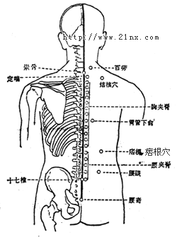 其穴在脊之十二椎下,旁开三寸半,痞块多在左,则灸左;在右则灸右;如左右俱有,左右俱灸之。