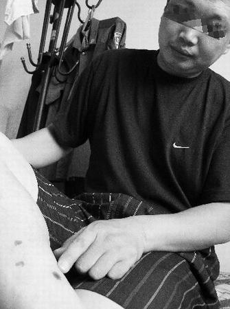 刑警队长王纯青指着被陆吉付咬伤的腿部。