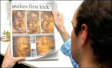 2004年6月29日,英国伦敦街头,一名男子在街头浏览报刊上12周大婴儿在母体内活动图。