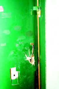 22日清晨7时许,西安市大庆路劳动村小区1号楼一单元一楼住户王某起床后发现,自家墙上电灯拉线盒处有红色液体渗出,天花板接缝处同样也有大量液体渗出,液体将天花板染红了一大片。王某以为是楼上漏水,便到二楼于家欲问个究竟。费力敲了半天门后,二楼住户于臻斌缓缓开门,但只探出了个头,表情也十分古怪。还没等王某说话,一阵恶臭就从屋里迎面袭来,呛得他恶心不已。