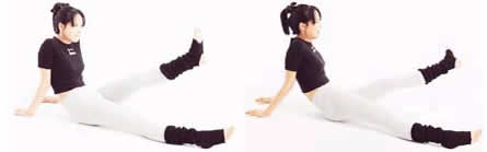 (吸气)坐在地板上,手放在身体后侧,腿伸直,脚尖绷直。深吸气后,大腿使劲将左脚抬起离地约10cm。