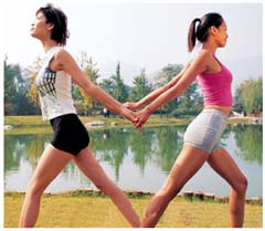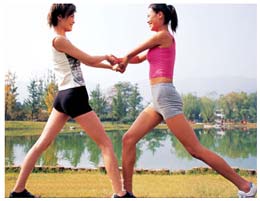 与你的同伴面对面站立,两个人的右 脚都前跨半步,左脚原地不动。彼此双手十字交叉后握紧。身体微微向后倾斜,体会背部和肩膀的伸展感觉。保持姿势深呼吸3次。换左腿前跨,重复。双腿轮换做10组。