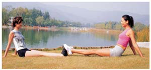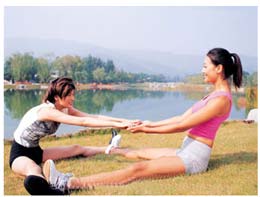与同伴相向而坐,双腿尽量向身体两侧分开,上身微微前屈,握住彼此的双手或手腕;脚掌与同伴脚踝部位相抵;上身向后仰,双臂弯曲,将同伴向自己身体方向拉,令其双臂伸直,身体前屈,甚至臀部可微微提起。保持伸展姿势并深呼吸3次。变换双方位置,重复动作10次。