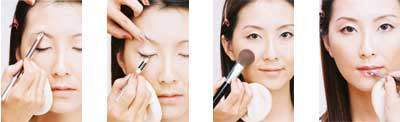如果是一般粉状的的眼影(饼),先用眼影刷沾少量的眼影,画在眼窝处,然后再一层一层上眼影,可做出渐层感。如果是液状或膏状眼影,先用手将眼影膏点在眼折中间,然侯以放射状将眼影膏推开推匀即可。由于东方人的眼睛,多数较为浮肿,建议少用浅色眼影,如果要用,也要尽量画在眼折处,再用深肤色或浅咖啡色眼影画眼窝,如果没有浮肿的问题,就无此限制。