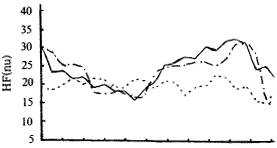 附图 正常组及冠心病组服用硫氮酮前、后TP、HFn、LFn 24 h变化曲线