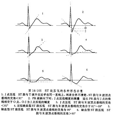 (1)在R波占优势的导联上,运动后出现水平型或下垂型ST段压低(ST段与R波顶点垂线的交角≥90°),超过0.05mV,持续2分钟者。如原有ST段压低者,运动后在原有基础上再压低超过0.05mV,持续2分钟。