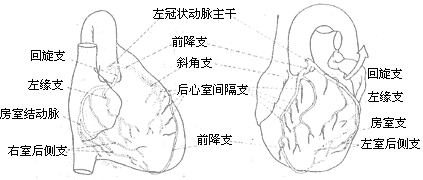 右冠状动脉较小,左冠状动脉回旋支发出后降支供血到左、右心室后壁及心室间隔。