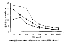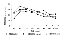 不管城市与农村,儿童腹泻患病率随着月龄的增长而降低 (图2)。贫困农村儿童腹泻患病率在各个月龄均高于城市和一般农村,患病高峰城市在12个月以内,农村在18个月以内。24个月以后一般农村与城市基本一致。