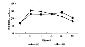 近几年,全球大气污染日趋恶化,不管城市与农村,儿童呼吸系统疾病患病率 呈上升趋势。在城市1998年比1990年上升了9.5个百分点,农村上升了6.9个百分点。1992年与1998年比较,在24个月龄有一交叉,1992年24个月龄以前高于1998年,而1998年24个月龄以后儿童患病率高于1992年。1992年儿童呼吸系统疾病患病高峰在6~12个月龄,1998年高峰在36~48个月龄。而农村儿童呼吸系统疾病患病率两年的趋势一致,是随年龄上升而下降,1998年在各个年龄组儿童患病率均比1992年高。