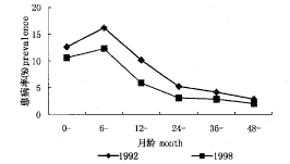 图6 1992年与1998年城市5岁以下儿童腹泻患病率