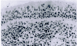 3.2 气道粘膜改变 哮喘和慢支均有不同程度的上皮损伤(上皮糜烂、脱落、增生和鳞状上皮化生),粘膜水肿,纤维化以及基底膜增厚,但是哮喘的基底膜增厚尤为明显,有学者提出当哮喘病变持续时,粘膜基底膜增厚,基底膜不仅有机械性支持作用,而且还影响上皮细胞的功能〔8〕。可见基底膜在哮喘的发病中起着一定的作用,但其产生的机制尚待进一步探讨。