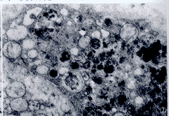 3.5 电镜观察表明 哮喘组肥大细胞除了2例长期激素治疗者外均有不同程度的脱颗粒,而慢支组8例中无1例有脱颗粒,此结果提示:(1)肥大细胞在超微结构上脱颗粒变化可以作为诊断根据之一;(2)激素治疗哮喘可能是通过抑制肥大细胞脱颗粒来发挥抑制哮喘的作用。这为临床上用激素治疗哮喘提供了形态学依据;肥大细胞脱颗粒可作为激素治疗哮喘反应的指标之一。电镜下各类炎细胞计数在哮喘组和慢支组相比差异无显著性,可能是电镜观察范围有较大局限性所致。
