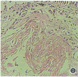 不同点:哮喘组患者支气管粘膜基底膜明显增厚于慢支组患者(P<0.05),其平滑肌增厚亦较慢支组明显,粘膜下层细胞浸润以EOS、肥大细胞(MC)为主(图1),与慢支组比较差异有显著性(P<0.01,表3),慢支组气道粘膜糜烂、水肿、粘膜下淋巴细胞、巨噬细胞、嗜中性粒细胞等炎性细胞浸润与哮喘组比较,差异无显著性(P>0.05),但其中嗜中性粒细胞增多较哮喘组显著,粘膜水肿、纤维化程度较哮喘组严重(图2)。