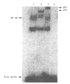 1 阳性对照组;2 加抗p50抗体;3 加抗p65抗体;4 阴性对照组