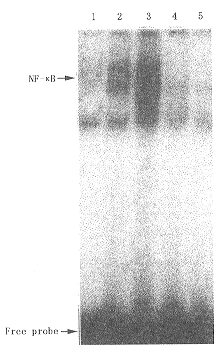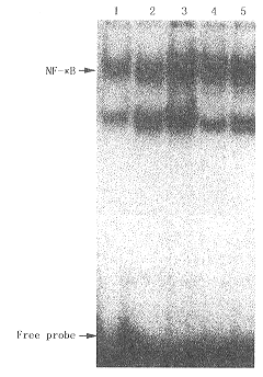 标记探针序列如下:5′-AGT TGA GGG GAC TTT CCC AGG C-3′,3′-TCA ACT CCC CTG AAA GGG TCC G-5′。应用[γ-32P]ATP(北京亚辉公司)标记,在T4多核苷酸激酶作用下进行,聚丙烯酰胺凝胶纯化后与适量核蛋白(10 μg)进行结合反应,经8%聚丙烯酰胺凝胶电泳 3 h(在125 V电压下进行),80℃干胶后于-70℃下进行放射自显影,显影后利用凝胶分析系统(英国UVP公司)进行密度扫描,以扫描值作为NF-κB活性的量化值。超迁移率实验:于加入探针前先加入抗体适当量4℃下孵育30 min,其他步骤相同。