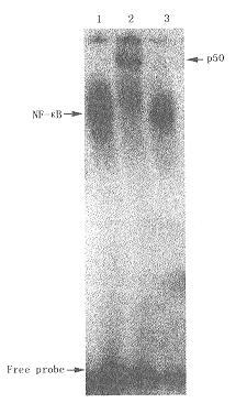 1 阳性对照组;2 加抗p50抗体;3 加抗p65抗体