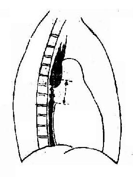 以上各型亦可混合出现,综合食管癌中晚期的X线表现,其癌瘤处管腔轮廓不规则,有充盈缺损,不对称性狭窄或溃疡形成。癌处的粘膜皱襞破坏,管壁僵硬,蠕动消失、钡剂通过缓慢,常有不同程度的梗阻,其上方食管扩张(图5-15)。有时可在癌肿处显示软组织包块影。