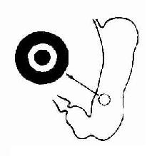 (2)龛影附近改变:①粘膜水肿:溃疡周围由于炎症肿胀,正位观龛影周围常出现环形透光区称为月晕征(图5-23),其外缘逐渐消失在正常影像内,可随加压而略有变化。侧位观视疡口部的肿胀程度不同,可出现前述的窄颈征。如颈部有宽约0.5cm、边界光滑的密度减低区,状如颈部戴有项圈,称为项圈征(图5-24)。如宽约1-2mm透光线则为粘膜线