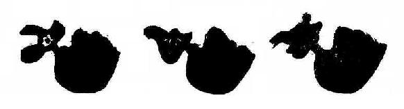 ③器官变形:十二指肠溃疡常见球部变形(Bulb deformity)。因球部较小,溃疡周围的炎症水肿、肌肉痉挛、瘢痕收缩及周围粘连等原因,容易使球部失去正常形态。典型的球部变形呈山字形、花叶形等(图5-26)常见其内有一个钡点状龛影。因溃疡较小,加之变形,故龛影显示率较低(约60%上下)。溃疡愈合后,因炎症或痉挛所引起的变形可恢复正常形态。