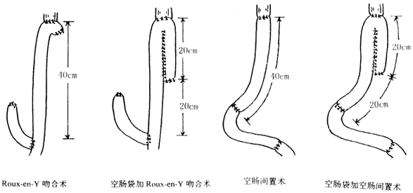 即全胃切除术后在屈氏韧带下20cm处切断空肠,远段空肠断端关闭,并经结肠后提起,于距断端20cm处将其对折行侧-侧吻合,由此形成Hunt-Lawrence袋。食管末端与空肠袋顶点吻合。在吻合口下方40cm处将近段空肠与远段空肠行端-侧吻合,十二指肠近端关闭。此术式稍复杂,优点是增加了食糜的容量,同时延缓了食糜的排空时间。缺点是食糜不经过十二指肠。