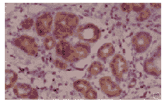 图3p16在慢性胃炎中的表达-阳性染色为棕黄色,p16在胞核、胞浆均有染色,DAB染色×400