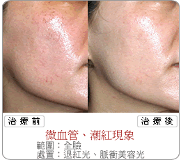 在台湾现在常用于除皱功能的机种有三:铒雅各雷射、冷触雷射及脉冲美容光。铒雅各雷射效果虽佳,但是过程辛苦,恢复期长达三、四个月且有反黑危险;冷触雷射较温和,标榜的是利激皮下纤维再生,达成皮肤改善目的,但缓不济急且收费不便宜;临床上发现脉冲美容光介于两者之间,效果约一周即可看见。施术过程并不影响日常生活、刺激皮肤胶原芽细胞增生之功能持续约一个月。可以发现毛孔缩小、色素淡化、皱纹变浅、皮肤平滑以及微血管扩张改善。