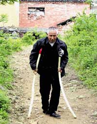 一段时间后,刘心祥发现二儿子总在咳嗽。到1998年,二儿子已经病得不能再去宜兴了,甚至要吸着氧气才能走到自家的院子里,但家人都不知道他害了什么病。直到去年年底,刘老汉才在?东看到了儿子工作的作坊式工厂。这里全部没有采用国家规定的“施湿作业”,不能一边轧石一边喷水,而是干式作业,生生地把大石块磨成砂状。轧砂机一响,淡黄色的粉尘漫天飘扬,3米之内不能辨人。没有防尘装置,也没有防尘面罩,民工们在这样的环境下,一天要工作15个小时。