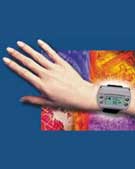 这种称为GlucoWatch(Cygnus公司研制)的手表式葡萄糖监测装置的工作原理,是透过皮肤吸取组织液,测定吸出液的葡萄糖浓度。先将装置预热,再用刺指葡萄糖检测法进行标定后,该装置即可提供13小时内每小时6个无痛葡萄糖测定数据。如果葡萄糖达到危险水平,该装置即可发出警报。