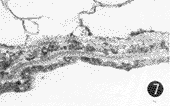 图7 链脲佐菌素注射后6个月RBM,示RBM负电荷位点减少 ×25000图8 链脲佐菌素注射后6个月GBM,示GBM负电荷位点减少 ×20000