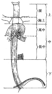 食管的分段法:从1940年吴英恺在我国首次成功切除你内食管癌开始,即采用了下述分段法:上段自食管入口(相当于颈椎第6水平)到主动脉弓上缘,又再分为自食管入口到胸骨切迹的颈段和自胸骨切迹到主动脉弓上缘(T4上缘)的胸上段;中段自弓上缘起到下肺静脉下缘(T6下缘)止,下段从下肺静脉下缘到贲门(包括膈下腹段食管)。此分段法缺点:①主动脉弓作为标记不是恒定的,它随年龄增长而屈曲延长上移;②胸下段偏短,胸中段偏长,分割不均等;③下肺静脉有时显示不清,不易辨认以及中段包括了气管分叉上下两部分所谓高位中段和低位中段,但两者的切除率和预后是差别很大的。中国沿用的食管解剖分段见图2。