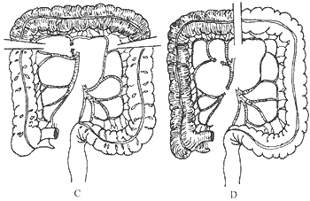 由于存在结肠血运变异,准备作结肠移植前必须仔细观察各支间的吻合支是否通畅。原则上是在血运许可情况下尽可能作顺蠕动结肠移植,例如切断结肠中动脉,保留结肠左动脉利用横结肠与部分降结肠,或者是切断结肠右动脉及回结肠动脉,保留结肠中动脉,利用升结肠及部分横结肠。只有在上述两种情况血运不充足,表现为临时阻断将要切断之血管后,移植段远端末梢动脉搏动消失,退而求其次,作逆蠕动移植,如切断结肠左动脉,保留结肠中动脉,利用横结肠及部分降结肠,或是切断结肠右动脉,保留结肠中动脉,利用横结肠,因为结肠中动脉位置偏右,逆蠕动移植较方便。逆蠕动移植后主要之缺点为病人常有嗳气、呃逆及结肠内容物的突然上漾(图1)。