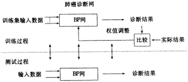 将描述病人各种情况的数据作为前向网络的输入数据加到其输入端,并按(1)~(6)式计算各神经元的输入和输出,同时调整神经元之间的连接权值以使网络的输出和实际的病例情况相符。即当病人确实患肺癌时网络的输出结果也恰好指示为肺癌,反之亦然。如果对所有的训练样本集网络的输出基本上(95%或更高)能保证与实际结果一致,则训练过程结束。我们认为神经网络已建立起病人的各种因素与他是否是肺癌患者之间的函数映射关系。对于一个新的候诊病人来说,只要将他的情况输入到训练好的神经网络中去,根据网络的输出结果就可以知道他是否已患肺癌,见图2。