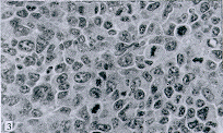 形,边界清楚,核大染色深,核结构清晰,核分象多见 ×40图4 癌细胞边界不清,胞浆出现空泡变性,核固缩、破裂、溶解,出现坏死。核分裂象少见