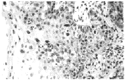 Diagnosis mainly relies on histolopathologic findings. If the metastatic tumor is well-differentiated and closely resembles a carcinoma of a specific site, the pathologist can say with reasonable certainty that a given metastatic tumor comes for a specific primary site. However, more often, metastatic carcinomas are poorly-differentiated and histopathologic study of the metastatic deposit gives little clue as to the primary site of the tumor. In our cases, all showed an adenocarcinoma, lobular type. Less differentiated adenocarcinoma was present in case 5, in which neoplastic cells invaded overlying epithelium resulting in an unusual pagetoid appearance (Fig. 3). Between 20%~30% of the grou had jaw metastases as the first indication of harboring a malignant neoplasm. In such instances, seeking a primary neoplasm based upon the frequencies of metastases is practical. Batsakis tabulated the site of origin of 115 cases of primary neoplasms that metastasized to the jaws as:breast 30.4%, kidney 15.6^, lung 14.8%, colon and rectum 7.8%, prostate gland 7%, thyroid gland 6.1%, stomach 5.2%, skin (melanoma) 4.4%, testes 2.6%, and the rest were less than 1%[2]. In our 21 cases of metastatic neoplasms in the jaws, the primary tumors, in order of decreasing frequency, were as follows: breast, lung, skin, colon, stomach, thyroid, and prostate gland. One case was of unknown origin. McDaniel et al found that, of 32 histologically verified cases metastatic to the jaws, the origin of the primary neoplasms could not be located in 9 of the cases[14].