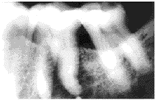 Radiograph showing an ill-defined radiolucency associated with vital left lower first molar.
