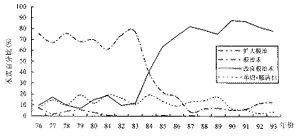 多中心前瞻性随机临床试验已经证实,在无腋窝淋巴结转移患者应用CMF方案进行辅助化疗可以同时显著提高无病生存率和总生存率[1,5];最近一项随机临床 试验表明,在绝经前有腋窝淋巴结转移的乳腺癌患者,采用含蒽环类药物的CEF方案进行辅助化疗,较应用CMF方案可以获得更高的无病生存率和总生存率[6]。三苯氧胺提高乳腺癌患者生存率的作用亦十分明确[1,2,5]。我们新近的资料还证实,长期服用三苯氧胺还可以有效降低对侧乳腺癌的发生率[7]。本研究证实,1984~1985年规范术后辅助化疗与内分泌治疗后,乳腺癌患者的5年总生存率有显著提高。虽然1986年以后预后较好的Ⅰ、Ⅱ期患者比例显著增大,在很大程度上提高了患者的总体预后,但是这并非总生存率提高的全部原因。一方面,1986年以后预后最好的Ⅰ期患者所占比例并没有显著提高,而预后最差的Ⅳ期患者的比例却上升了1倍余,相应死亡患者占全部可分期患者死亡数的比例也显著升高,在很大程度上抵消了Ⅱ期患者比例增高对预后的影响;另一方面,Ⅲ、Ⅳ期患者死亡总数在1986年前后分别高达全部可分期患者死亡数的56.5%和40.9%,说明此期患者生存率的改善对全组患者总体预后具有很大的影响。1986年以后各期患者10年生存率的改善尚无统计学意义,但除Ⅱ期患者之外,其它各期患者的10年生存率均已出现了改善的趋势,并且同样在Ⅲ、Ⅳ期患者较为明显。这可能是由于全身性治疗效果的提高可能对全身性转移危险较大、预后较差的晚期患者生存率的改善作用较为显著,而对死亡率原本较低的早期患者改善作用较小,可能需要更大规模的研究方能确定其统计学意义。