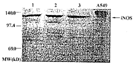 2.4 Western-blotting法测iNOS蛋白 将LC裂解物进行SDS-PAGE电泳,然后将胶进行Western-blotting,结果如图4所示,图中1、2、3为三株LC,显示iNOS阳性,阳性对照为A549细胞。