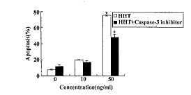 2.3 HHT通过激活Caspase-3诱导细胞凋亡 现认为Caspase 在 细胞凋亡过程中发挥重 要作用,尤其是Caspase-3是整个凋亡过程的一个重要环节, Z-DEVD-FMK是Caspase-3 酶的特异性抑制剂。取经HHT作用后24 h的细胞上清液测得的Caspase-3 的活性 ,在 HHT 10 ng/ml和50 ng/ml水平,可观察到 Molt-3细胞的Caspase 酶的活性随着剂量加大而 增高 (图5),提示Caspase-3在Molt-3细胞的凋亡过程 被激活;进一步用 Z-DEVD-F MK先于HHT与细胞作用,2 h后加入HHT继续作用20 h,用流式细胞仪测凋亡, 发现Caspase-3抑制剂能抑制Molt-3细胞的凋亡(图6)。