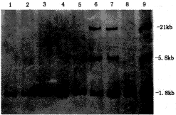 用Southern blot分析了35例AL和5例正常人的淋巴细胞DNA,BamHⅠ消化的DNA用α-32P-dCTP标记MTS1的CDNA 探针进行杂交,出现一条21 kb带型(内含MTS1基因外显子Ⅰ和外显子Ⅱ)和一条5.8 kb带型(内含外显子Ⅱ)并以c-sis基因(探针由衡阳医学院分子生物学中心提供)作为内对照,所有标本均出现一条1.8 kb片段(c-sis基因杂交的阳性结果)。如果未出现21 kb带型,则说明有p16纯合子缺失。结果显示6例T-ALL中有2例为纯合子缺失,25例B-ALL中有4例(16%)为纯合子缺失,4例AML及5例正常人未检出纯合子缺失(图1)。