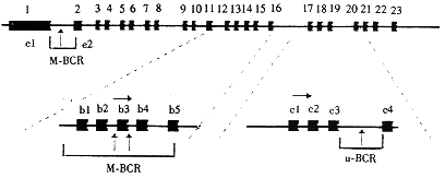 根据22号染色体断裂点的精确定位,可将M-BCR重组分为两个区域,即M-BCR的5′端和3′端重组(见图1)。Schaefer-Rego等[2]认为M-BCR内的断裂点定位可能与CML急变相关,尤其断裂点在3′端的容易急变。也有学者认为:BCR断裂部位(亚区b2或亚区b3)与患者的病程、存活期及预后无明显关系,但与患者急变的细胞类型有一定的关系。断裂点在亚区b2与亚区b3比较,发生急性髓系白血病(AML)的急变明显多于急性淋巴细胞白血病(ALL)的急变[3]。但不少学者未能证实这些相关性,现认为这些不同的结果可能是由于对病例选择的差异以及对确切发病期估计的不同所致。