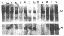 图3 Ⅰ为正常人标本(正常对照),p53为低表达,诱导后p53及p21表达均增加,说明p53功能正常。第1、5、7例与Ⅰ类似。第6例阿霉素组比对照组p53表达明显增加但无相应的p21增加,其功能依然异常。