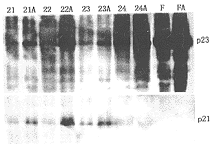 条带上数字为病例号,其后有A者代表阿霉素组,无A者代表对照组,F代表Fadu细胞株(阳性对照),H代表HL-60细胞株(阴性对照),M为标记的分子量(图2~4均相同表示)。可见第3、4例与Fadu类似,对照组及阿霉素组p53均为强表达而p21无表达或表达很低且两组间无差别,提示p53功能异常。HL-60对照组与阿霉素组p53及p21均无表达。