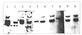 1.3.2 Southern Blot:1)标记探针:所用探针包括AML1cDNA(外显子5,6)探针C6E6H(由日本琦玉肿瘤研究中心Miyozhi博士惠赠)、AML1基因组(内含子5)探针和MTG8基因组探针probe8(分别由Himnerznuth医院的Tighe和Calabi博士惠赠)。上述探针按随机引物法用α-p32-dCTP标记,用Sephadex-50层析纯化,标记探针的比活性大于1×109min-1.ug-1DNA。2)转膜杂交:取10μg基因组DNA,经EcoRⅠ及(或)BamHⅠ完全酶切,进行0.6%琼脂糖电泳,转移至硝酸纤维素膜上,然后固定、预杂交、杂交、洗膜、放射自显影。
