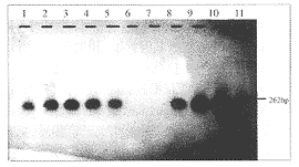图3 RT-PCR扩增产物与探针C6E6H2杂交结果。1~5,8~11为M2b,3、4为t(8;21)(-)M2b,6、7为M2a2.3 微小残留病检测