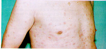 患者男,68岁,1996年6月24日以全身出现红色斑块2周就诊。2周前无明显诱因背部出现数个红色硬结,约黄豆至蚕豆大,无不适,未重视。随后皮疹成批出现,很快遍及躯干及四肢近端。发病以来无发热,无瘀斑及牙龈出血和黑便。5年前患喉鳞状细胞癌行半喉切除及同期皮瓣转移术。2个月前患左舌下腺鳞状细胞癌,行左舌下腺肿瘤切除及同侧舌骨上区淋巴结清除术,术后未行放疗及化疗。