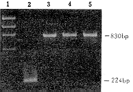 4.辅助病毒的检测:在逆转录病毒介导的基因转移中,靶细胞被复制缺陷型病毒感染后应无病毒反式结构基因整合。辅助病毒的筑巢式PCR检测结果如图2所示,3种转导细胞除出现内对照MDR-1的830bp产物外,均未能扩增出env基因,而作为对照的GP+envAm12则出现224bp的阳性条带,表明本基因转移体系中无辅助病毒产生。在补救分析实验中,重组的复制缺陷型病毒仅能将NeoR基因转移至NIH3T3细胞,后者因无病毒反式结构基因的补救而不能再将NeoR基因转移至NIH3T3受体细胞,经G418选择后均未见有抗性克隆生长,从功能上证实无辅助病毒的产生,表明该基因转移系统是较为安全的。