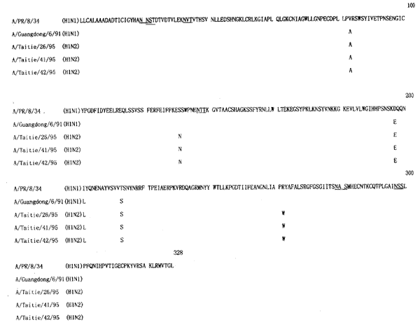 图1表明:测定和比较毒株HA1基因均编码328个氨基酸,有共同的6个糖基化位点,HA1与HA2连接处均为一个精氨酸(R);3株H1N2毒株HA1蛋白分子上见不到有氨基酸序列的差异;而H1N2与A/PR/8/34(H1N1)毒株间有6个位点不同,分别位于83(V-A),131(S-N),197(D-E),201(I-L),213(T-S)和262(R-W),其同源性为98.2%(322/328),然而,与A/Guangdong/6/91(H1N1)毒株间仅有两个差异:131(S-N)和262(R-W)。其同源性高达99.4%(326/328)。这些差异中除131和197分别位于A和B抗原决定簇区外,其余均位于非抗原决定簇区。