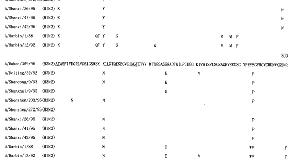 同时,图1还表明三株H1N2病毒HA1区氨基酸序列与当时人群中流行的甲1(H1N1)A/北京/262/95及以往发现的H1N2亚型毒株A/哈防/1/88的同源性仅分别为83.4%和84.0%。