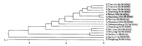 图4结果表明,A/Taitie/42/95毒株NA基因与1995年的H3N2毒株的NA基因最接近,与其它被比较的N2毒株有较大差异。